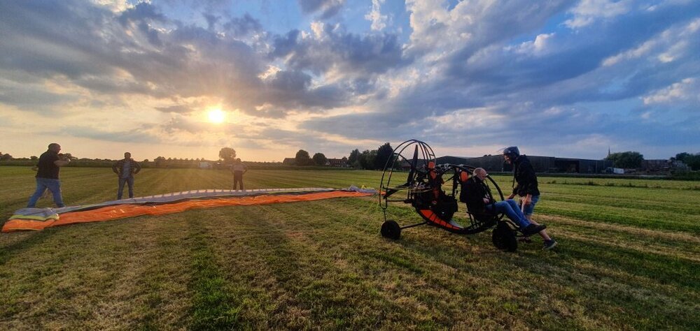 Wij paramotorvliegen met een trike: een soort driewieler die geschikt is voor het wijde luchtruim. Hier kunnen twee personen in: een passagier en een instructeur. Eerst maken we vaart op vlakke grond en hierna beweegt de trike zich langzaam omhoog. Onze ervaren en gecertificeerde instructeur zorgt ervoor dat alles veilig verloopt. Eenmaal boven in de lucht is het puur ontspannen: je ervaart letterlijk het gevoel van vrijheid en zweeft 45 minuten in de lucht. Je voelt de wind langs je heengaan en hoort de geluiden op de grond.