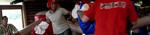 Luchtkussen, de tegenstanders proberen met enorme bokshandschoenen te boksen met elkaar.