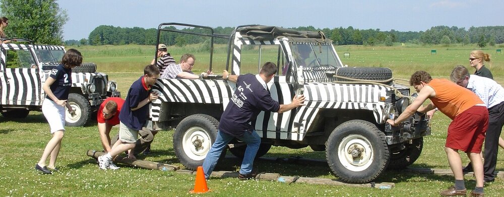 - SPECIAL TASK: Lukt het jouw team zonder hulp? Dat klink spannend! Is het ook! Deze activiteit is geheel in Camel Trophy stijl. Het hele team moet een auto met behulp van menselijke kracht een bepaalde afstand laten overbruggen. De motor mag dus niet starten. Werk nauwkeurig en communiceer optimaal met het hele team. Alleen op die manier bereik je het gewenste resultaat! Deze activiteit, inclusief instructie, duurt ongeveer een ½ uur.